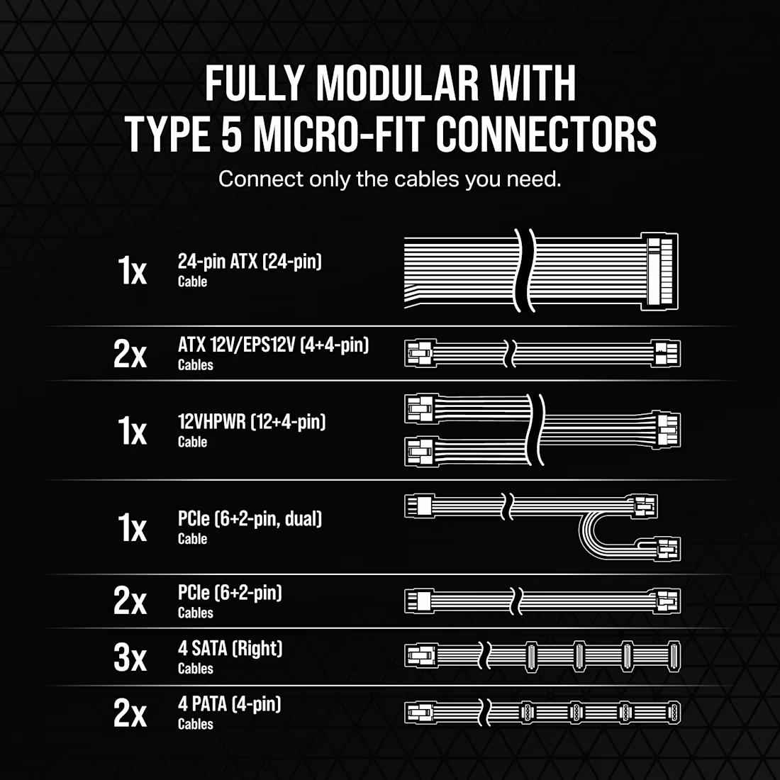 | Modular Cable System | Fully modular, using CORSAIR Type-5 micro-fit connectors — only use cables needed to reduce clutter and improve airflow |