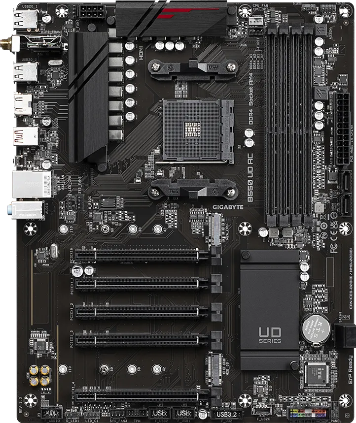 Comprehensive CPU Support — The Gigabyte B550 UD AC Gaming Motherboard supports a wide range of AMD Ryzen™ AM4 processors including 5000, 5000 G, 4000 G, and 3000 series, giving builders flexibility for high-performance or cost-effective CPUs.