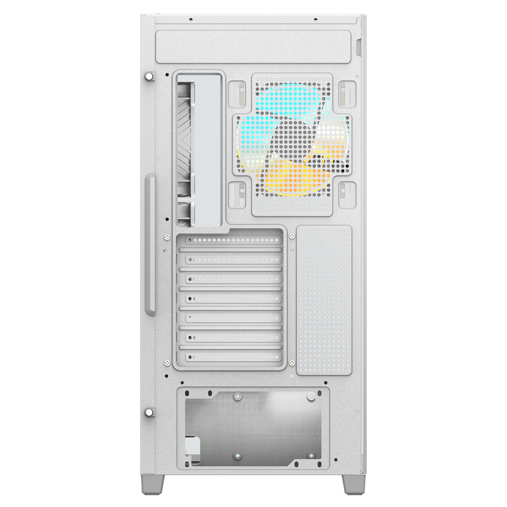 As for cooling, the Gigabyte White ARGB Gaming Cabinet supports a variety of configurations: up to three 120 mm or two 140 mm fans on top, three 120 mm fans on the side, three 120 mm fans at the bottom, and either a 120 mm or 140 mm fan at the rear.