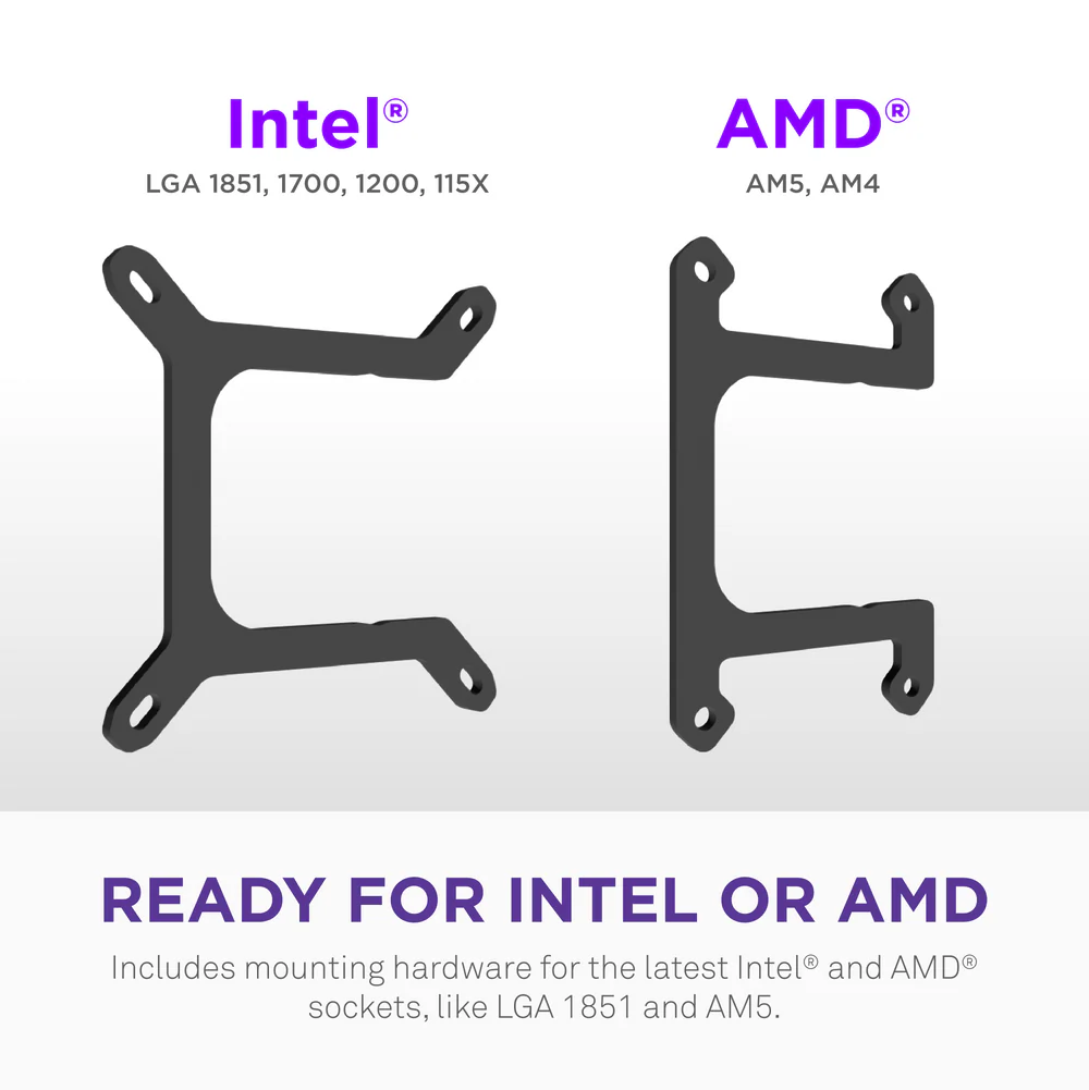 On the Intel side, it fits LGA 1851, LGA 1700, LGA 1200, and older LGA 115X sockets.